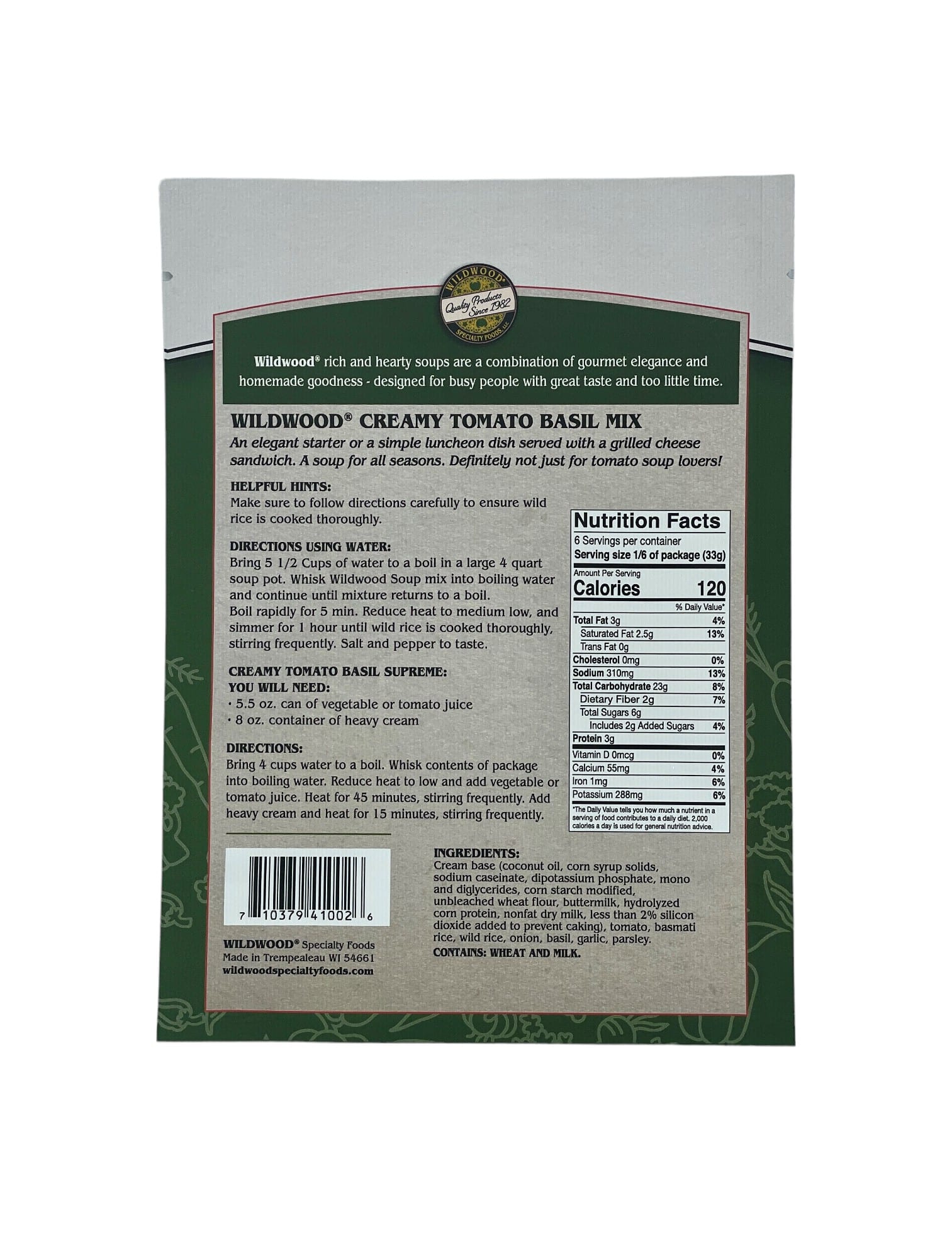 Ingredients: Cream Base: [ Coconut oil, corn syrup solids, sodium caseinate, dipotasium phosphate, mono and diglycerides, corn starch modified, corn syrup solids, unbleached wheat flour, buttermilk, hydrolyzed corn protein, nonfat dry milk, less than 2% silicon dioxide added to prevent caking] Tomato, Basmati Rice, Wild Rice, Onion, Basil, Garlic, Parsley